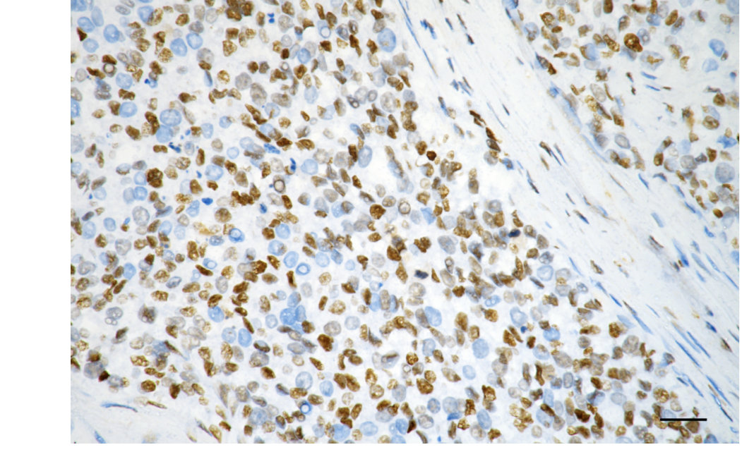 Immunohistochemistry was performed on paraffin-embedded human breast carcinoma using RBBP4 antibody. Antigen retrieval was done in sodium citrate buffer (pH 6.0). DAB was used for detection, with hematoxylin counterstaining. Images were acquired using a Nikon Ci-L Plus microscope (40× objective). Scale bar: 25 μm.