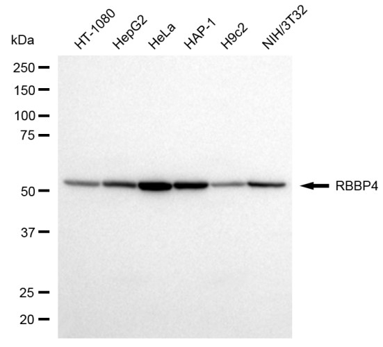 Western blotting analysis using RBBP4 antibody. Total cell lysates (30 μg) from various cell lines were loaded and separated by SDS-PAGE. The blot was incubated with RBBP4 antibody and HRP-conjugated goat anti-rabbit secondary antibody respectively.