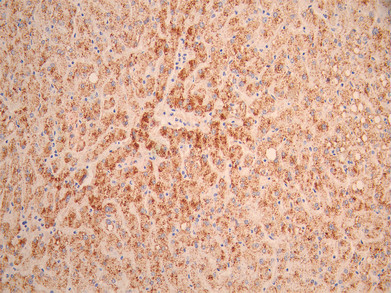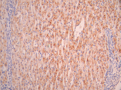 IHC image of CSB-RA019483MA1HU diluted at 1:50 and staining in paraffin-embedded human liver tissue performed on a Leica BondTM system. After dewaxing and hydration, antigen retrieval was mediated by high pressure in a citrate buffer (pH 6.0). Section was blocked with 10% normal goat serum 30min at RT. Then primary antibody (1% BSA) was incubated at 4°C overnight. The primary is detected by a Anti-Human lgG, Fcy Fragment Specific labeled by HRP and visualized using 0.05% DAB.