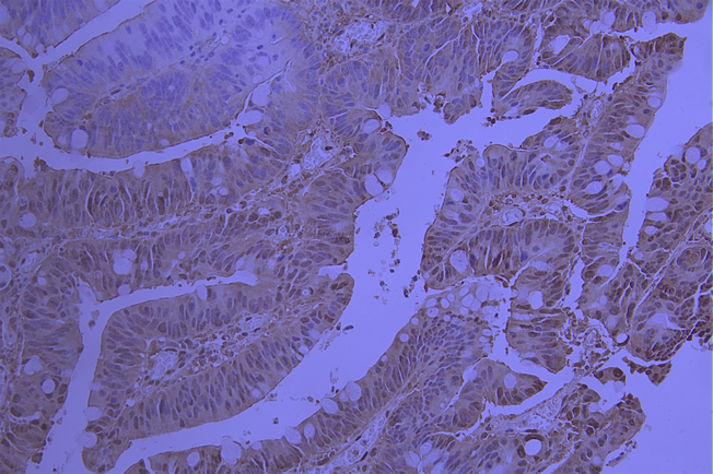 IHC image of CSB-RA157424A0HU diluted at 1:100 and staining in paraffin-embedded human colorectal cancer performed on a Leica BondTM system. After dewaxing and hydration, antigen retrieval was mediated by high pressure in a citrate buffer (pH 6.0). Section was blocked with 10% normal goat serum 30min at RT. Then primary antibody (1% BSA) was incubated at 4°C overnight. The primary is detected by a Goat anti-rabbit polymer IgG labeled by HRP and visualized using 0.05% DAB.