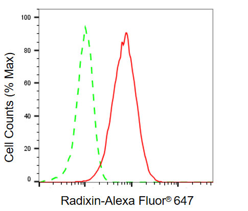 Flow cytometric analysis of radixin expression in HepG2 cells using radixin antibody. Green, isotype control; red, radixin.