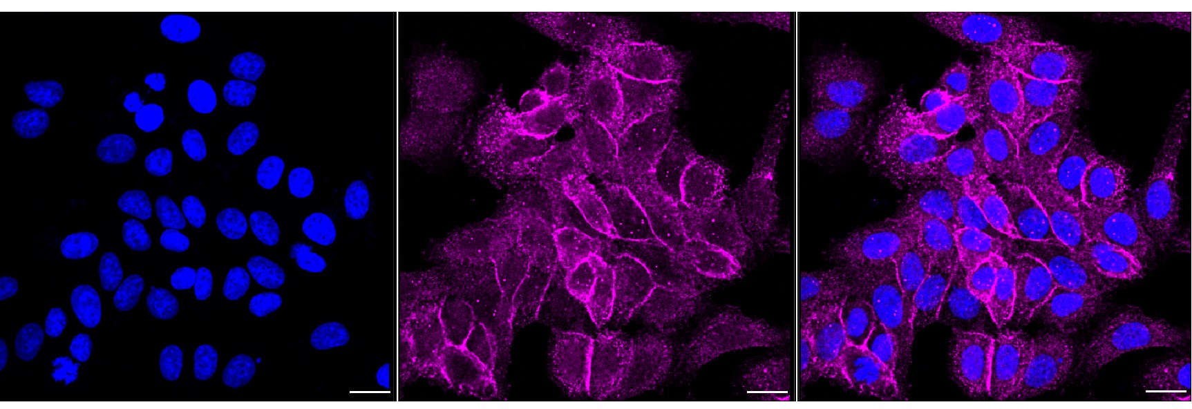 Immunocytochemical staining of HepG2 cells with Radixin antibody. Nuclei were stained blue with DAPI; Radixin was stained magenta with Alexa Fluor? 647. Images were taken using Leica stellaris 5. Protein abundance based on laser Intensity and smart gain: Medium. Scale bar, 20 μm.
