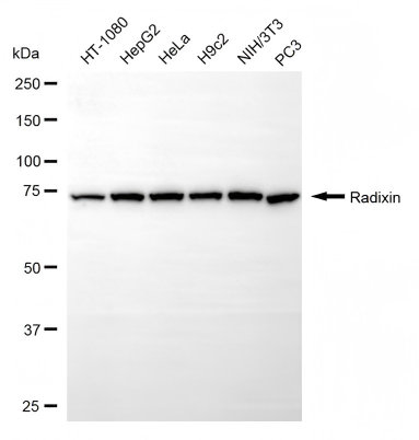 Western blotting analysis using radixin antibody. Total cell lysates (30 μg) from various cell lines were loaded and separated by SDS-PAGE. The blot was incubated with radixin antibody and HRP-conjugated goat anti-rabbit secondary antibody respectively.