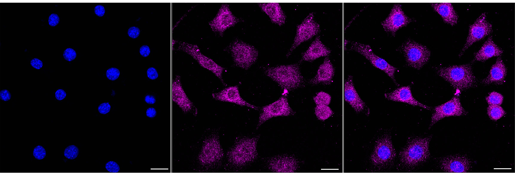 Immunocytochemical staining of C2C12 cells with RELB antibody. Nuclei were stained blue with DAPI; RELB was stained magenta with Alexa Fluor? 647. Images were taken using Leica stellaris 5. Protein abundance based on laser Intensity and Smart Gain: Medium. Scale bar, 20 μm.