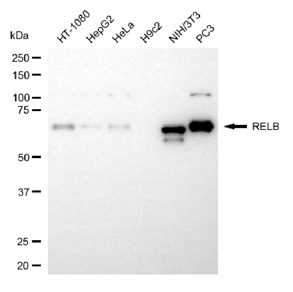 Western blotting analysis using RELB antibody. Total cell lysates (30 μg) from various cell lines were loaded and separated by SDS-PAGE. The blot was incubated with RELB antibody and HRP-conjugated goat anti-rabbit secondary antibody respectively.