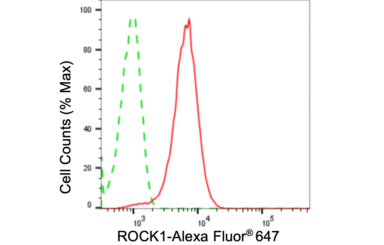 Flow cytometric analysis of ROCK1 expression in HeLa cells using ROCK1 antibody. Green, isotype control; red, ROCK1.