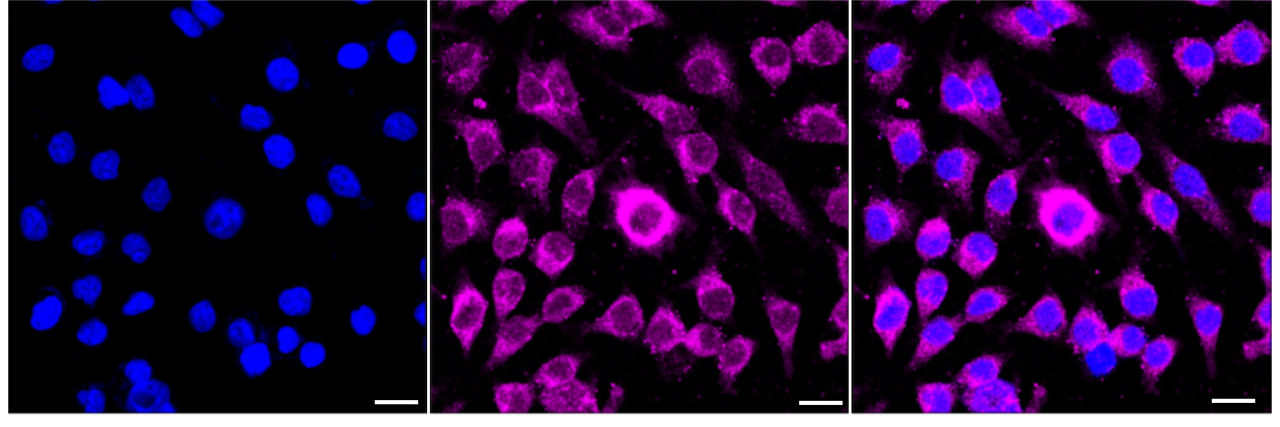 Immunocytochemical staining of HeLa cells with ROCK1 antibody. Nuclei were stained blue with DAPI; ROCK1 was stained magenta with Alexa Fluor? 647. Images were taken using Leica stellaris 5. Protein abundance based on laser Intensity and smart gain: Medium. Scale bar: 20 μm.