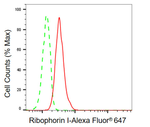 Flow cytometric analysis of ribophorin I expression in HT-1080 cells using ribophorin I antibody. Green, isotype control; red, ribophorin I.