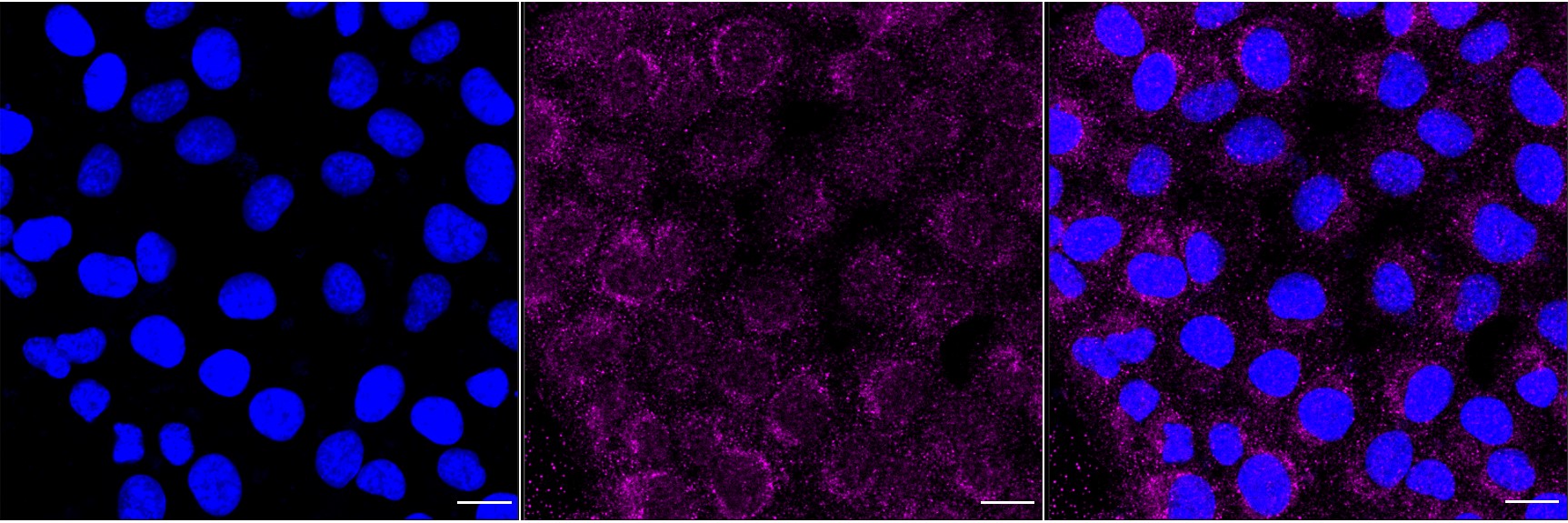 Immunocytochemical staining of HT-1080 cells with Ribophorin I antibody. Nuclei were stained blue with DAPI; Ribophorin I was stained magenta with Alexa Fluor? 647. Images were taken using Leica stellaris 5. Protein abundance based on laser Intensity and smart gain: Medium. Scale bar, 20 μm.
