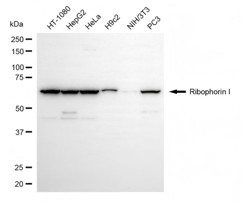 Western blotting analysis using ribophorin I antibody. Total cell lysates (30 μg) from various cell lines were loaded and separated by SDS-PAGE. The blot was incubated with ribophorin I antibody and HRP-conjugated goat anti-rabbit secondary antibody respectively.