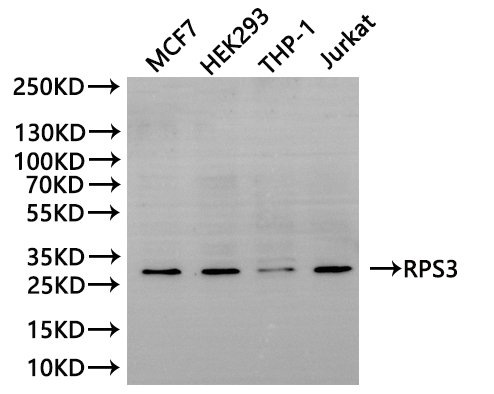 , Positive WB detected in:MCF7 whole cell lysate(30μg), HEK293 whole cell lysate(30μg), THP-1 whole cell lysate(30μg), Jurkat whole cell lysate(30μg)