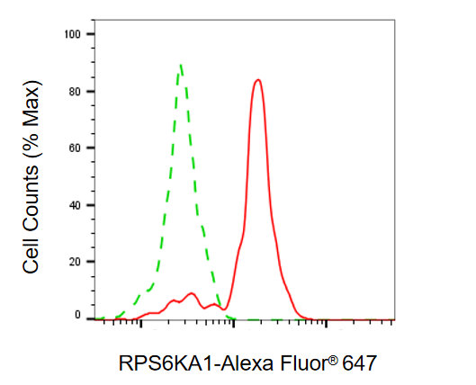 Flow cytometric analysis of RPS6KA1 expression in HeLa cells using RPS6KA1 antibody. Green, isotype control; red, RPS6KA1.