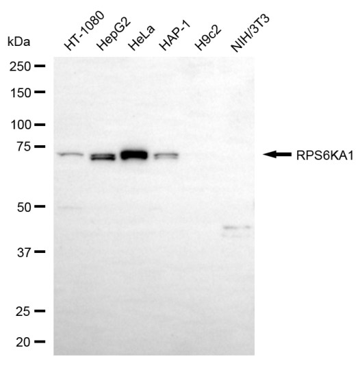 Western blotting analysis using RPS6KA1 antibody. Total cell lysates (30 μg) from various cell lines were loaded and separated by SDS-PAGE. The blot was incubated with RPS6KA1 antibody and HRP-conjugated goat anti-rabbit secondary antibody respectively.