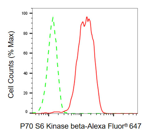 Flow cytometric analysis of P70 S6 Kinase beta expression in HeLa cells using P70 S6 Kinase beta antibody. Green, isotype control; red, P70 S6 Kinase beta.