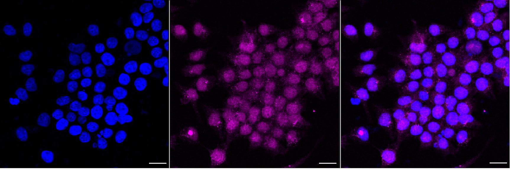 Immunocytochemical staining of HeLa cells with P70 S6 Kinase beta antibody. Nuclei were stained blue with DAPI; P70 S6 Kinase beta was stained magenta with Alexa Fluor? 647. Images were taken using Leica stellaris 5. Protein abundance based on laser Intensity and smart gain: Medium. Scale bar, 20 μm.