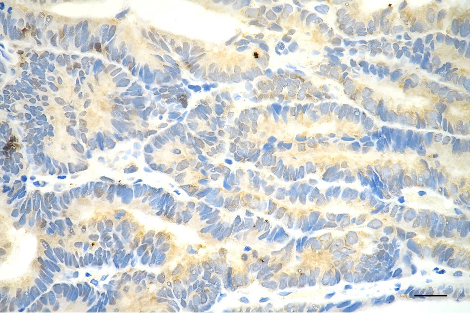 Immunohistochemistry was performed on paraffin-embedded human endometrial carcinoma using P70 S6 kinase beta antibody. Antigen retrieval was done in sodium citrate buffer (pH 6.0). DAB was used for detection, with hematoxylin counterstaining. Images were acquired using a Nikon Ci-L Plus microscope (40× objective). Scale bar: 25 μm.