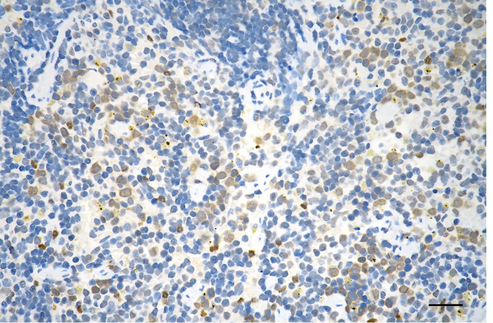 Immunohistochemistry was performed on paraffin-embedded mouse spleen using P70 S6 kinase beta antibody. Antigen retrieval was done in sodium citrate buffer (pH 6.0). DAB was used for detection, with hematoxylin counterstaining. Images were acquired using a Nikon Ci-L Plus microscope (40× objective). Scale bar: 25 μm.