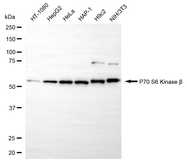 Western blotting analysis using P70 S6 Kinase beta antibody. Total cell lysates (30 μg) from various cell lines were loaded and separated by SDS-PAGE. The blot was incubated with P70 S6 Kinase beta antibody and HRP-conjugated goat anti-rabbit secondary antibody respectively.