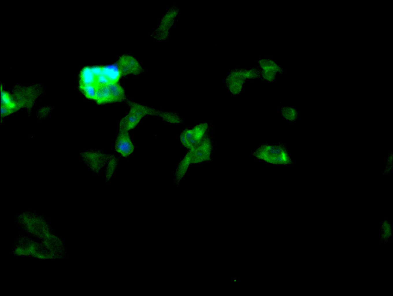 Immunofluorescence staining of SH-SY5Y cell with CSB-RA250534A0HU at 1:50, counter-stained with DAPI. The cells were fixed in 4% formaldehyde, permeabilized using 0.2% Triton X-100 and blocked in 10% normal Goat Serum. The cells were then incubated with the antibody overnight at 4°C. The secondary antibody was Alexa Fluor 488-congugated AffiniPure Goat Anti-Rabbit IgG(H+L).