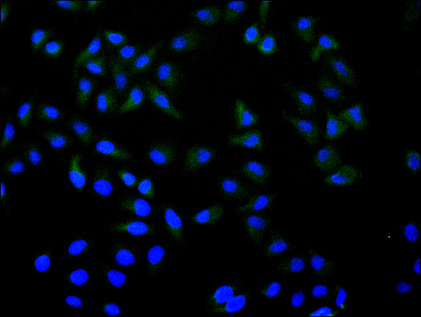 Immunofluorescence staining of Hela cell with CSB-RA201561A0HU at 1:50, counter-stained with DAPI. The cells were fixed in 4% formaldehyde, permeabilized using 0.2% Triton X-100 and blocked in 10% normal Goat Serum. The cells were then incubated with the antibody overnight at 4°C. The secondary antibody was Alexa Fluor 488-congugated AffiniPure Goat Anti-Rabbit IgG(H+L).