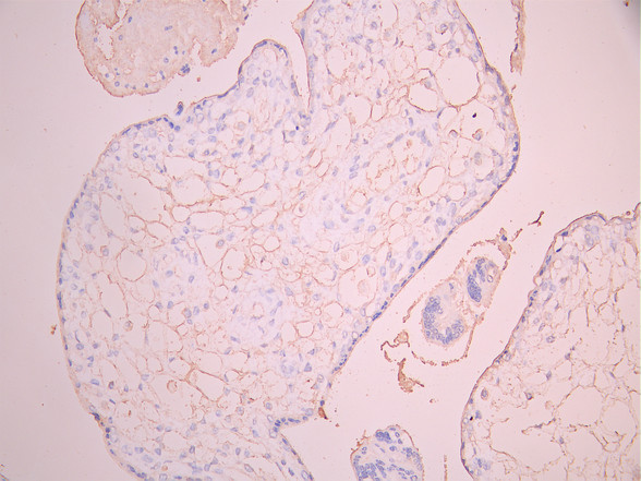 IHC image of CSB-RA859932MA1HU diluted at 1:50 and staining in paraffin-embedded human placenta tissue performed on a Leica BondTM system. After dewaxing and hydration, antigen retrieval was mediated by high pressure in a citrate buffer (pH 6.0). Section was blocked with 10% normal goat serum 30min at RT. Then primary antibody (1% BSA) was incubated at 4°C overnight. The primary is detected by a Anti-Human lgG, Fcy Fragment Specific labeled by HRP and visualized using 0.05% DAB.