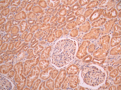 IHC image of CSB-RA903831A0HU diluted at 1:100 and staining in paraffin-embedded human kidney tissue performed on a Leica BondTM system. After dewaxing and hydration, antigen retrieval was mediated by high pressure in a citrate buffer (pH 6.0). Section was blocked with 10% normal goat serum 30min at RT. Then primary antibody (1% BSA) was incubated at 4°C overnight. The primary is detected by a Goat anti-rabbit polymer IgG labeled by HRP and visualized using 0.05% DAB.