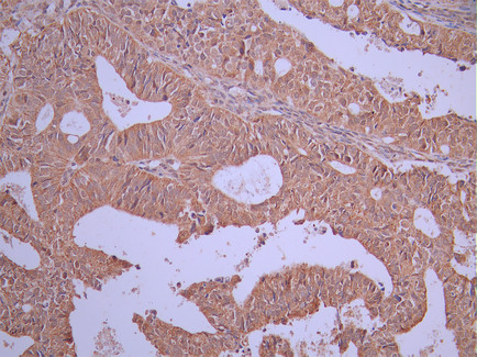 IHC image of CSB-RA903831A0HU diluted at 1:100 and staining in paraffin-embedded human ovarian cancer performed on a Leica BondTM system. After dewaxing and hydration, antigen retrieval was mediated by high pressure in a citrate buffer (pH 6.0). Section was blocked with 10% normal goat serum 30min at RT. Then primary antibody (1% BSA) was incubated at 4°C overnight. The primary is detected by a Goat anti-rabbit polymer IgG labeled by HRP and visualized using 0.05% DAB.