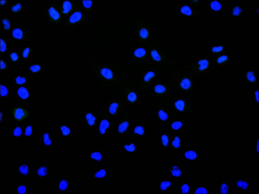 Immunofluorescence staining of HeLa cell with CSB-RA018252A0HU at 1:50 , counter-stained with DAPI. The cells were fixed in 4% formaldehyde, permeabilized using 0.2% Triton X-100 and blocked in 10% normal Goat Serum. The cells were then incubated with the antibody overnight at 4°C. The secondary antibody was Alexa Fluor 488-congugated AffiniPure Goat Anti-Rabbit IgG(H+L).