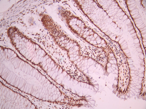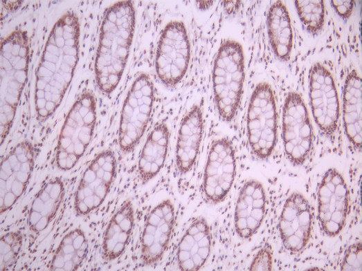 IHC image of CSB-RA018252A0HU diluted at 1:100 and staining in paraffin-embedded human colorectal cancer performed on a Leica BondTM system. After dewaxing and hydration, antigen retrieval was mediated by high pressure in a citrate buffer (pH 6.0). Section was blocked with 10% normal goat serum 30min at RT. Then primary antibody (1% BSA) was incubated at 4°C overnight. The primary is detected by a Goat anti-rabbit polymer IgG labeled by HRP and visualized using 0.05% DAB.