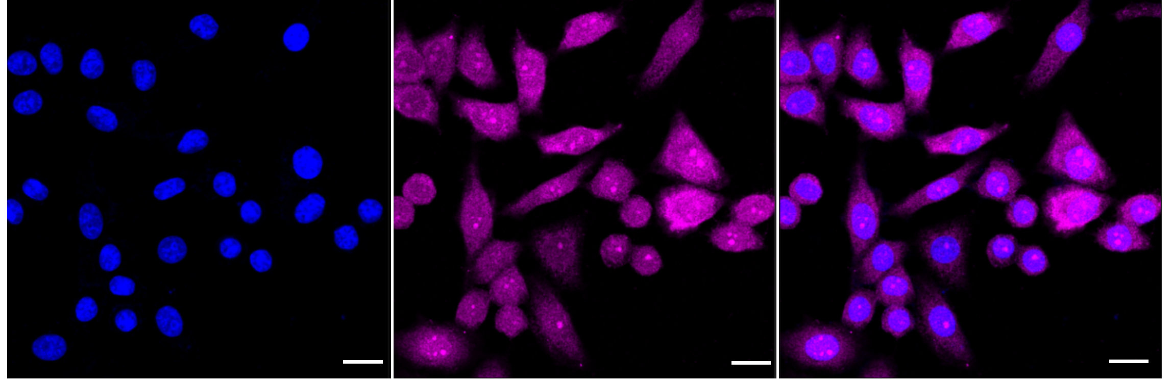Immunocytochemical staining of HepG2 cells with SBDS antibody. Nuclei were stained blue with DAPI; SBDS?was stained magenta with Alexa Fluor? 647. Images were taken using Leica stellaris 5. Protein abundance based on laser Intensity and smart gain: High. Scale bar: 20 μm.