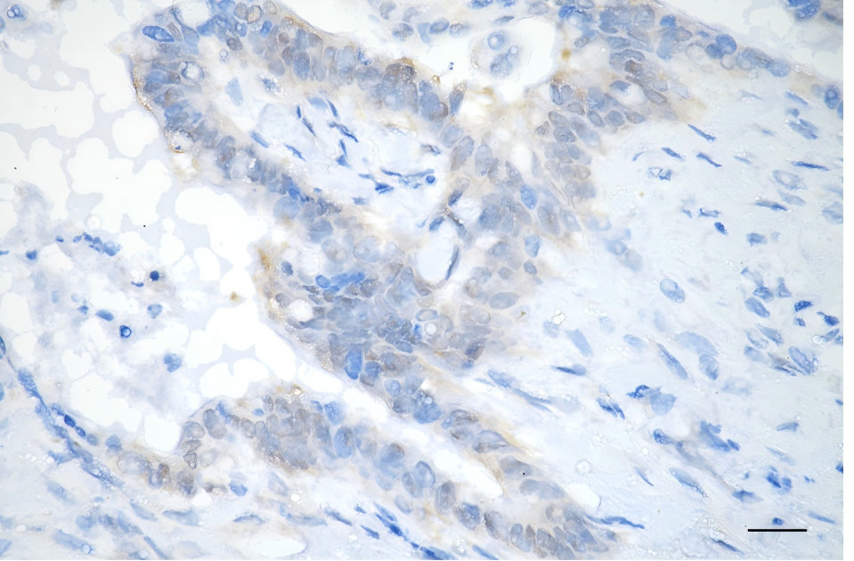 Immunohistochemistry was performed on paraffin-embedded human pancreatic adenocarcinoma using SBDS antibody. Antigen retrieval was done in sodium citrate buffer (pH 6.0). DAB was used for detection, with hematoxylin counterstaining. Images were acquired using a Nikon Ci-L Plus microscope (40× objective). Scale bar: 25 μm.
