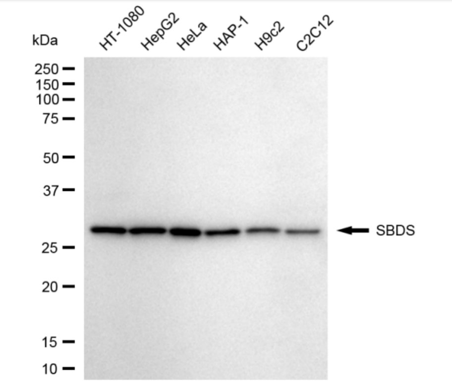 Western blotting analysis using SBDS antibody. Total cell lysates (30 μg) from various cell lines were loaded and separated by SDS-PAGE. The blot was incubated with SBDS antibody and HRP-conjugated goat anti-rabbit secondary antibody respectively.