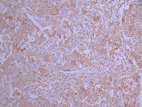 IHC image of CSB-RA104868A0HU diluted at 1:100 and staining in paraffin-embedded human liver cancer performed on a Leica BondTM system. After dewaxing and hydration, antigen retrieval was mediated by high pressure in a citrate buffer (pH 6.0). Section was blocked with 10% normal goat serum 30min at RT. Then primary antibody (1% BSA) was incubated at 4°C overnight. The primary is detected by a Goat anti-rabbit polymer IgG labeled by HRP and visualized using 0.05% DAB.