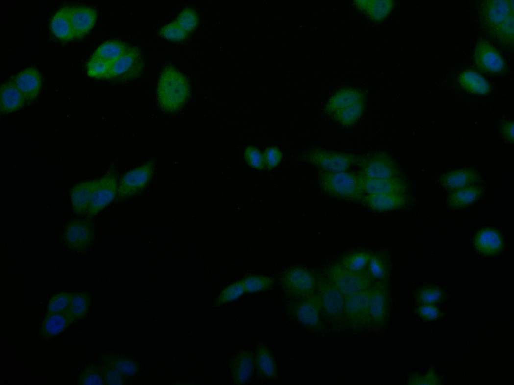 Immunofluorescence staining of PC-3 cell with CSB-RA150103A0HU at 1:50, counter-stained with DAPI. The cells were fixed in 4% formaldehyde and blocked in 10% normal Goat Serum. The cells were then incubated with the antibody overnight at 4°C. The secondary antibody was Alexa Fluor 527-congugated AffiniPure Goat Anti-Rabbit IgG(H+L).