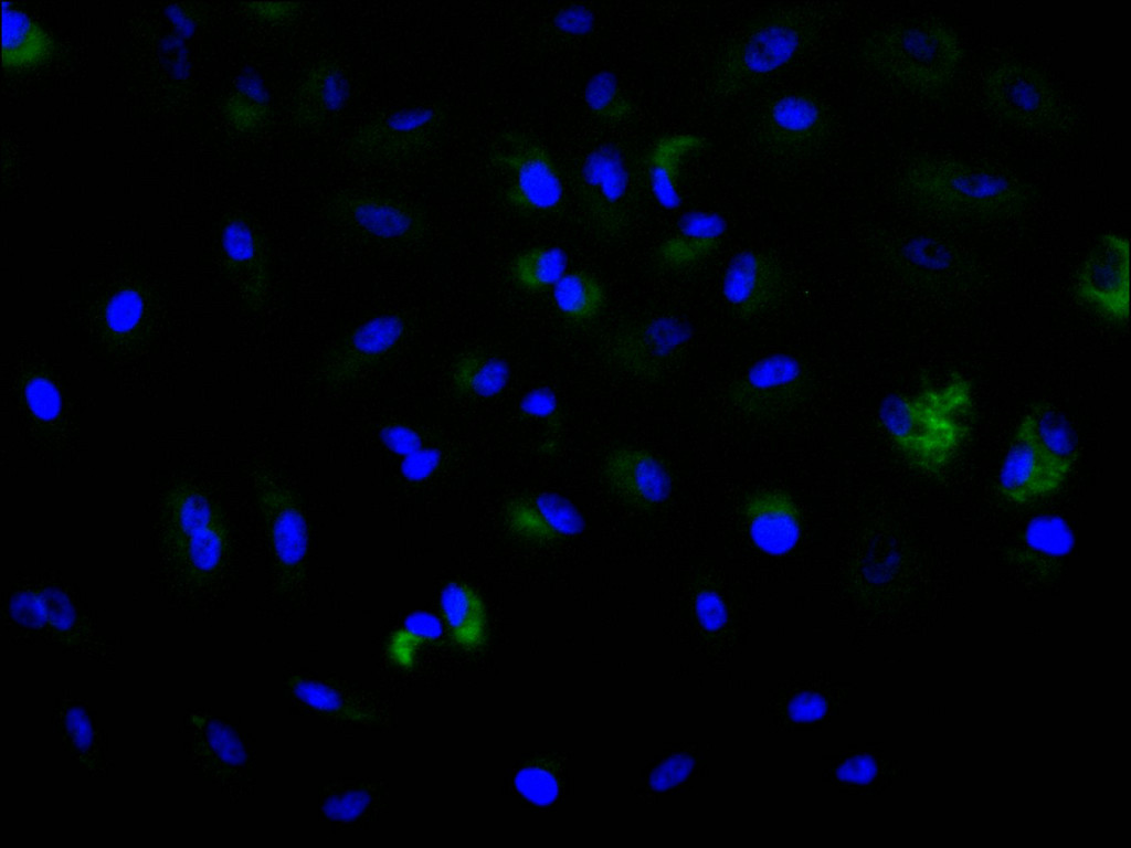 Immunofluorescence staining of A549 cell with CSB-RA104640A0HU at 1:50, counter-stained with DAPI. The cells were fixed in 4% formaldehyde, permeabilized using 0.2% Triton X-100 and blocked in 10% normal Goat Serum. The cells were then incubated with the antibody overnight at 4°C. The secondary antibody was Alexa Fluor 488-congugated AffiniPure Goat Anti-Rabbit IgG(H+L).