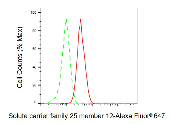 Flow cytometric analysis of solute carrier family 25 member 12 expression in C2C12 cells using solute carrier family 25 member 12 antibody. Green, isotype control; red, solute carrier family 25 member 12.