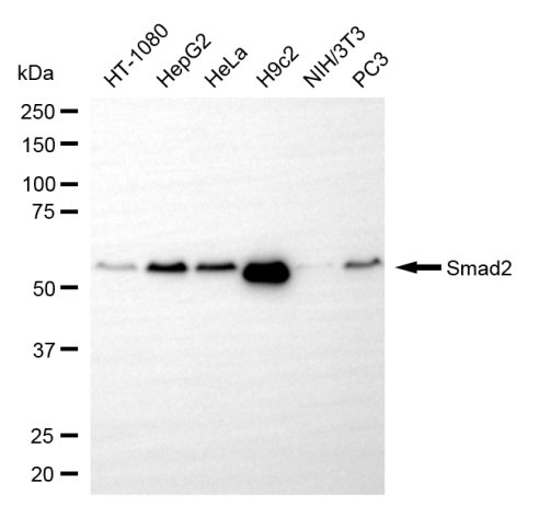 Western blotting analysis using smad2 antibody. Total cell lysates (30 μg) from various cell lines were loaded and separated by SDS-PAGE. The blot was incubated with smad2 antibody and HRP-conjugated goat anti-rabbit secondary antibody respectively.