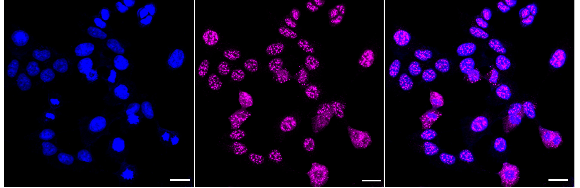 Immunocytochemical staining of HAP-1 cells with phospho-Smad3 (S423 + S425) antibody. Nuclei were stained blue with DAPI; Phospho-Smad3 (S423 + S425) was stained magenta with Alexa Fluor? 647. Images were taken using Leica stellaris 5. Protein abundance based on laser Intensity and smart gain: High. Scale bar: 20 μm.