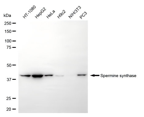 Western blotting analysis using spermine synthase antibody. Total cell lysates (30 μg) from various cell lines were loaded and separated by SDS-PAGE. The blot was incubated with spermine synthase antibody and HRP-conjugated goat anti-rabbit secondary antibody respectively.