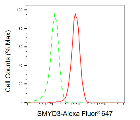 Flow cytometric analysis of SMYD3 expression in HepG2 cells using SMYD3 antibody. Green, isotype control; red, SMYD3.