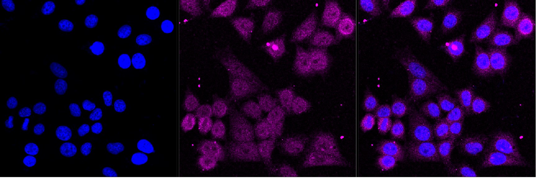 Immunocytochemical staining of HepG2 cells with SMYD3 antibody. Nuclei were stained blue with DAPI; SMYD3 was stained magenta with Alexa Fluor? 647. Images were taken using Leica stellaris 5. Protein abundance based on laser Intensity and smart gain: Medium. Scale bar, 20 μm.
