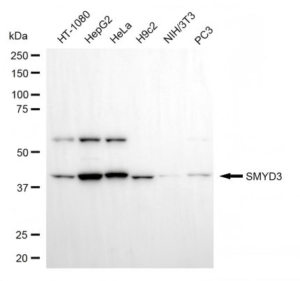 Western blotting analysis using SMYD3 antibody. Total cell lysates (30 μg) from various cell lines were loaded and separated by SDS-PAGE. The blot was incubated with SMYD3 antibody and HRP-conjugated goat anti-rabbit secondary antibody respectively.