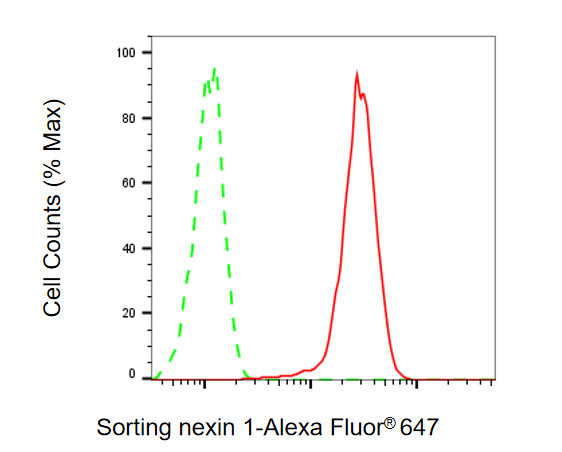 Flow cytometric analysis of Sorting nexin 1 expression in HepG2 cells using Sorting nexin 1 antibody. Green, isotype control; red, Sorting nexin 1.
