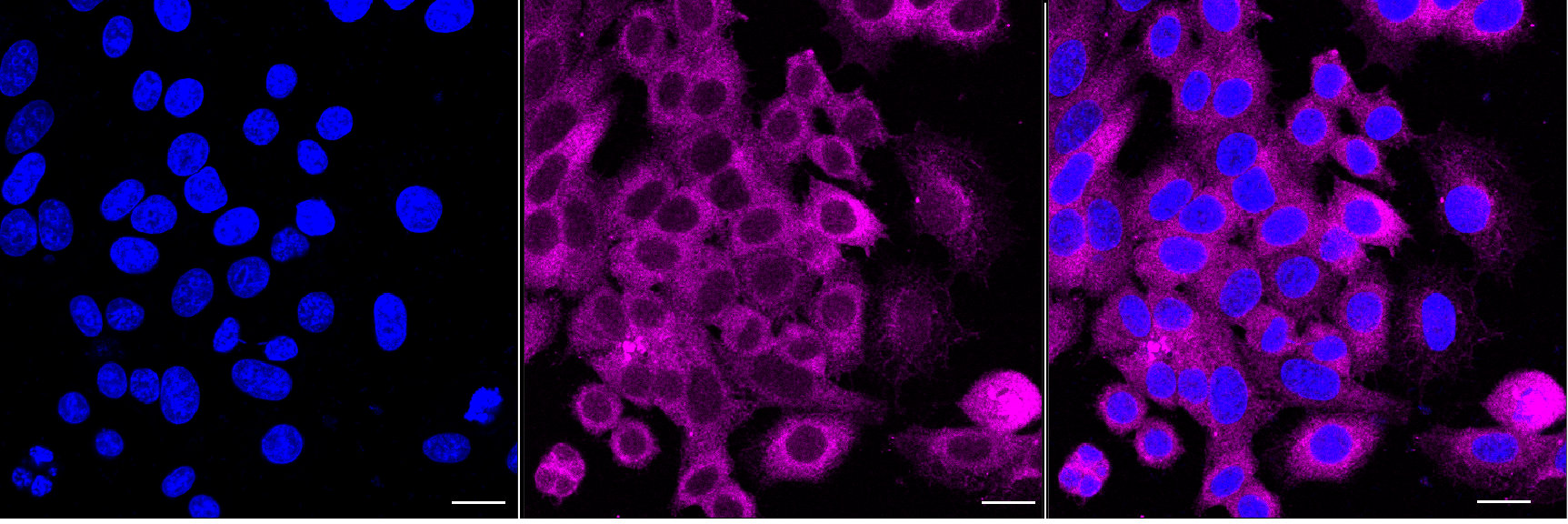 Immunocytochemical staining of HepG2 cells with Sorting nexin 1 antibody. Nuclei were stained blue with DAPI; Sorting nexin 1 was stained magenta with Alexa Fluor? 647. Images were taken using Leica stellaris 5. Protein abundance based on laser Intensity and smart gain: Medium. Scale bar, 20 μm.