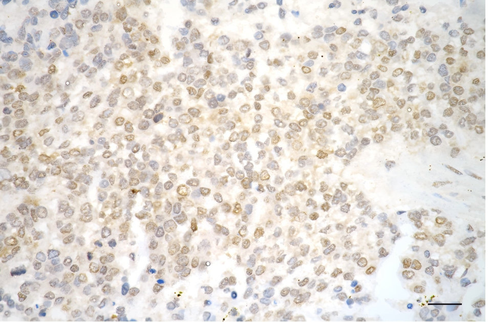 Immunohistochemistry was performed on paraffin-embedded human breast carcinoma using sorting nexin 1 antibody. Antigen retrieval was done in sodium citrate buffer (pH 6.0). DAB was used for detection, with hematoxylin counterstaining. Images were acquired using a Nikon Ci-L Plus microscope (40× objective). Scale bar: 25 μm.