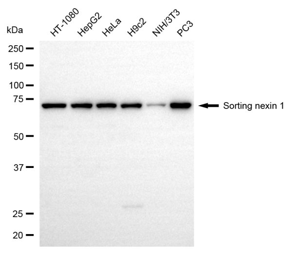 Western blotting analysis using sorting nexin 1 antibody. Total cell lysates (30 μg) from various cell lines were loaded and separated by SDS-PAGE. The blot was incubated with sorting nexin 1 antibody and HRP-conjugated goat anti-rabbit secondary antibody respectively.
