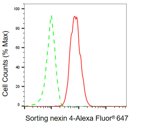 Flow cytometric analysis of sorting nexin 4 expression in C2C12 cells using sorting nexin 4 antibody. Green, isotype control; red, sorting nexin 4.