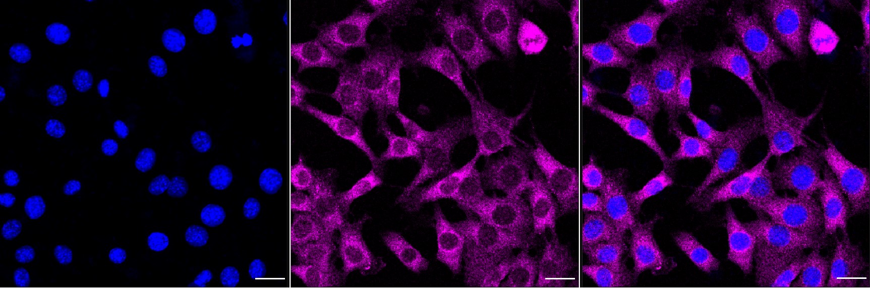Immunocytochemical staining of C2C12 cells with Sorting nexin 4 antibody. Nuclei were stained blue with DAPI; Sorting nexin 4 was stained magenta with Alexa Fluor? 647. Images were taken using Leica stellaris 5. Protein abundance based on laser Intensity and smart gain: Medium. Scale bar, 20 μm.