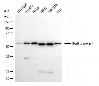 Western blotting analysis using sorting nexin 4 antibody. Total cell lysates (30 μg) from various cell lines were loaded and separated by SDS-PAGE. The blot was incubated with sorting nexin 4 antibody and HRP-conjugated goat anti-rabbit secondary antibody respectively.
