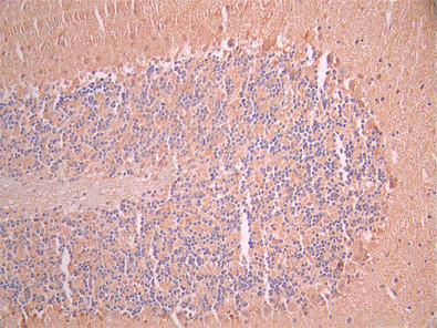 IHC image of CSB-RA859102MA1HU diluted at 1:50 and staining in paraffin-embedded mouse brain tissue performed on a Leica BondTM system. After dewaxing and hydration, antigen retrieval was mediated by high pressure in a citrate buffer (pH 6.0). Section was blocked with 10% normal goat serum 30min at RT. Then primary antibody (1% BSA) was incubated at 4°C overnight. The primary is detected by a Anti-Human lgG, Fcy Fragment Specific labeled by HRP and visualized using 0.05% DAB.